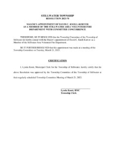 2023-70 Mayor’s Appointment of David Korver as Member of Stillwater Fire Dept