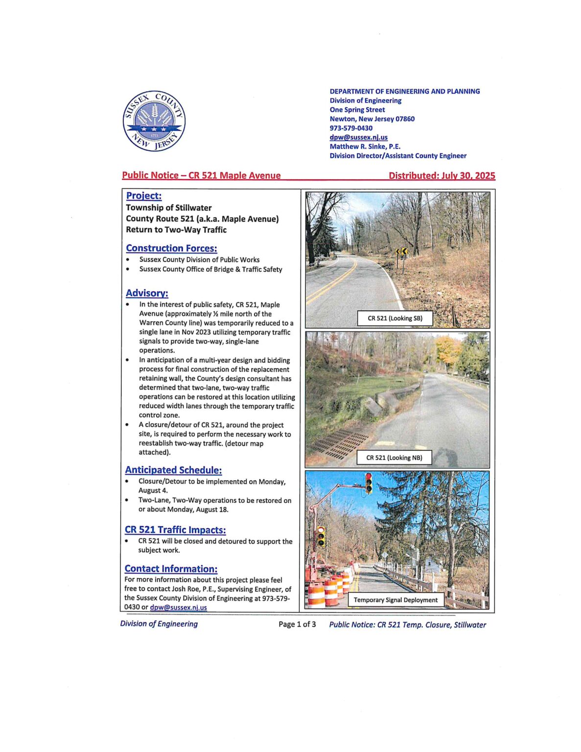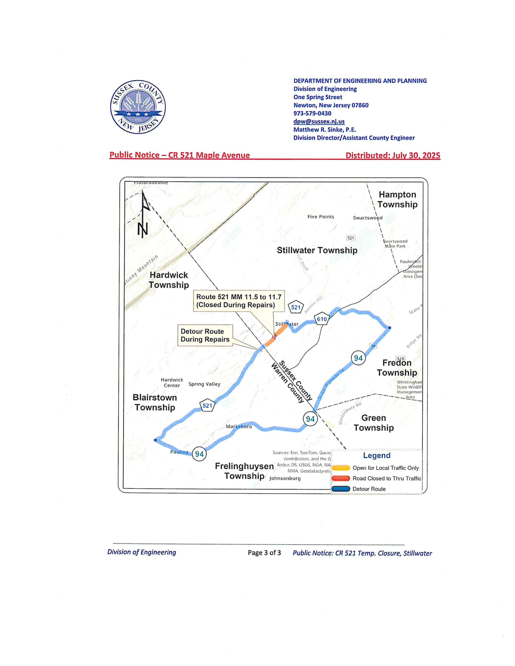Please be advised that on Monday, August 4, the Sussex County Division of Engineering will be implementing a closure and detour of CR 521 in Stillwater Township, at MM 11.6 (approximately ½ mile north of the Warren County line),  for approximately (2) weeks – (3) weeks.