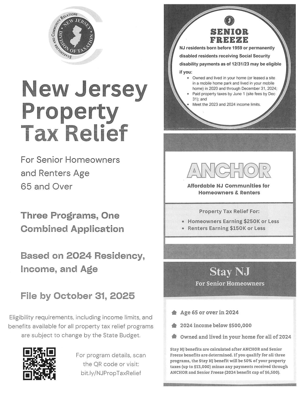 All other property tax relief programs are administered by the State of NJ: Homestead Rebate Property Tax
