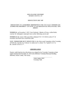 2025-185 RESOLUTION TO AUTHORIZE REDEMPTION FOR TAX SALE CERTIFICATE 25-00014 FOR PROPERTY LOCATED AT 944 RIDGE ROAD, STILLWATER, NEW JERSEY