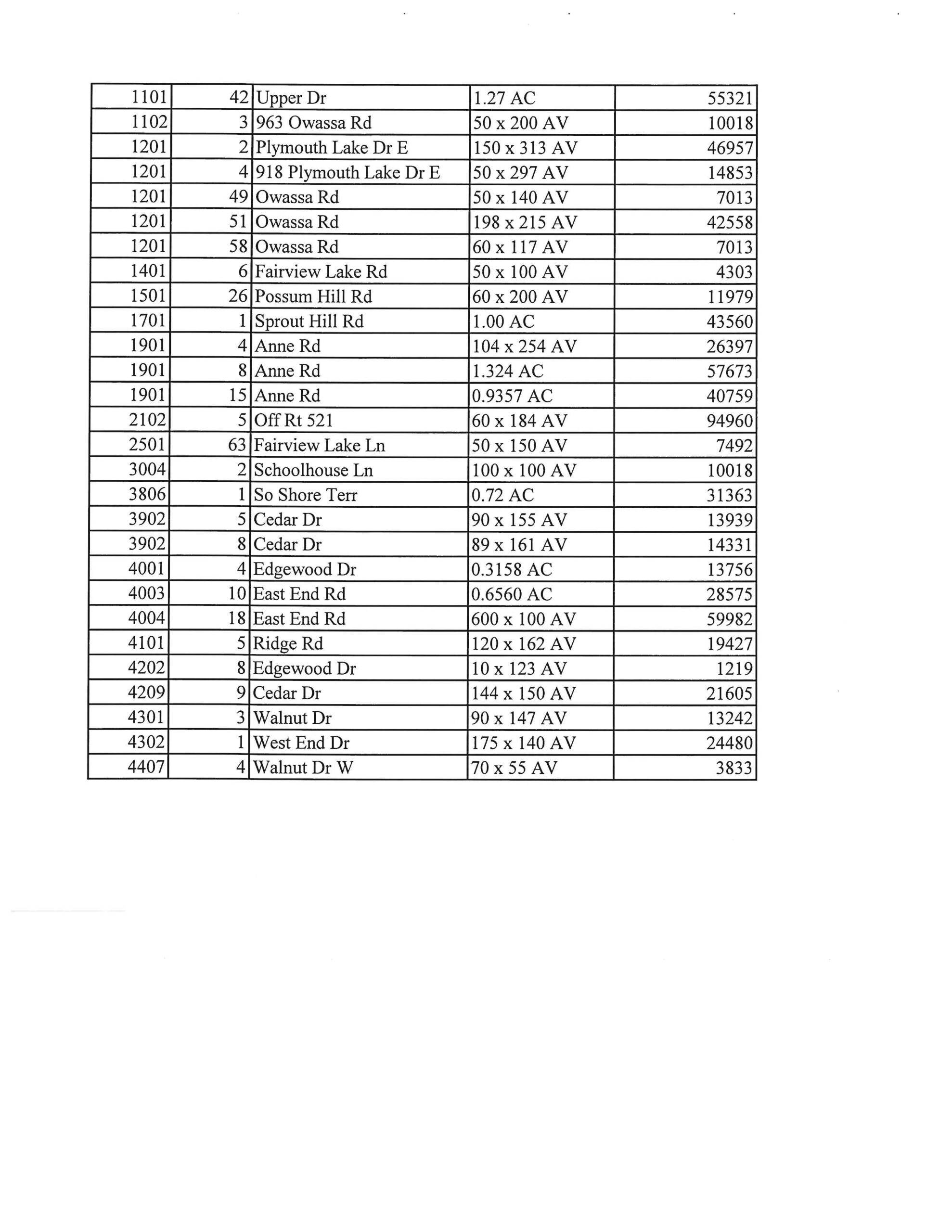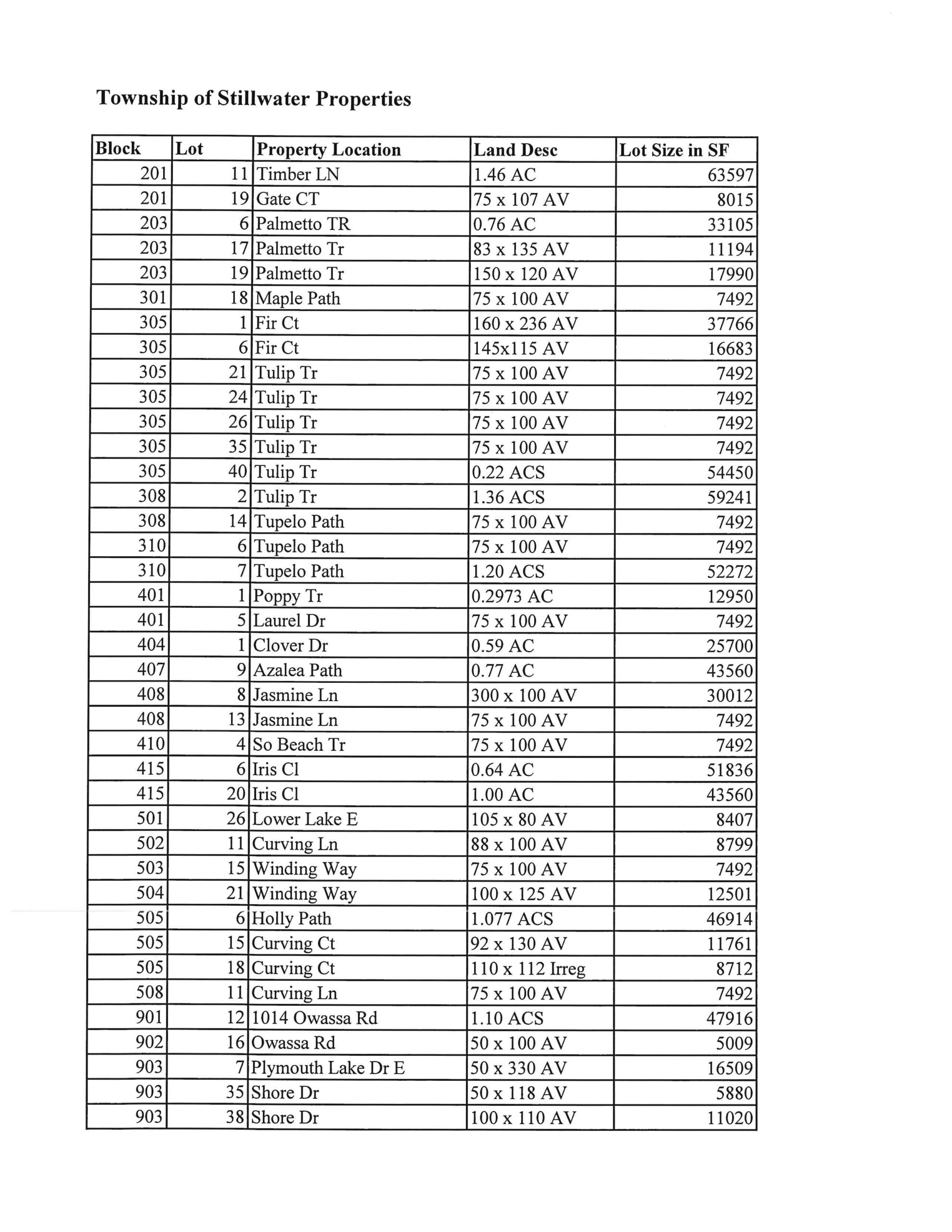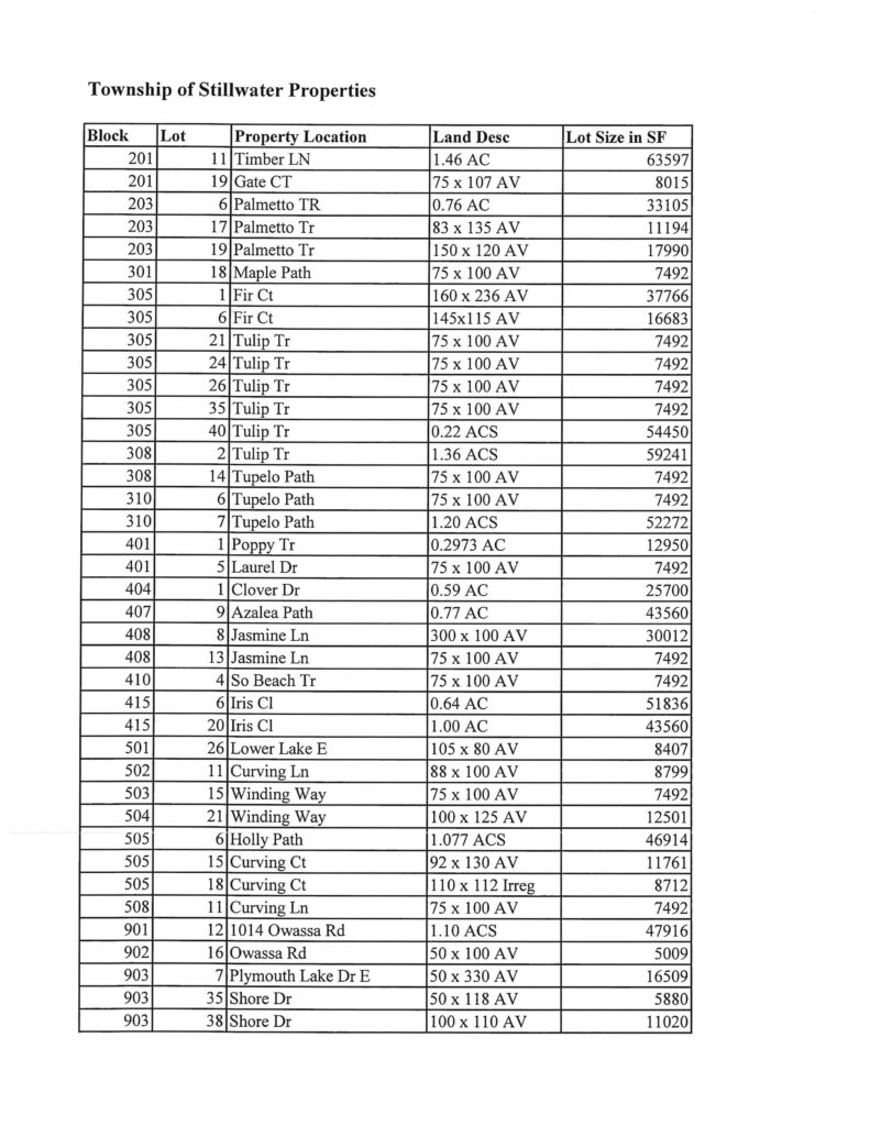 Please take a look at the list of township-owned properties below. You can locate your block and lot information on your tax bill, deed, or by clicking on property taxes on the website, then enter your name or address. If you are a contiguous owner to one of these properties and are interested in purchasing it, please contact the Municipal Clerk at clerk@stillwatertwp.com or 973-383-9484 x22. The auction will be in early May 2026. Please express your interest by April 1, 2026, with your name, address, email, and phone number.